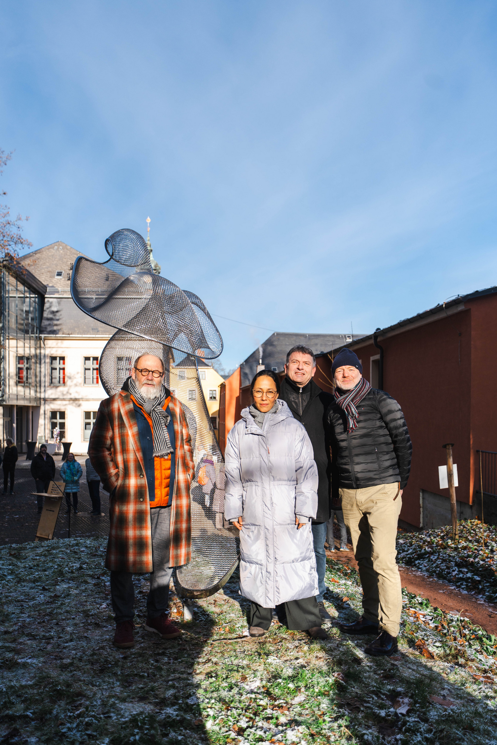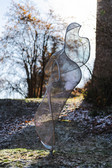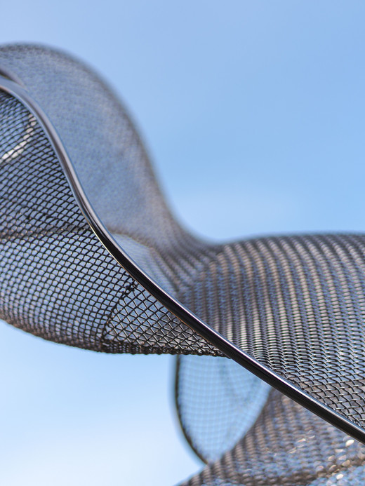 A delicate-looking stainless steel net stretches across a winding round tube frame, reaching upwards. Lines intersect or drift apart, the surfaces appear tense and relaxed at the same time. They create a vague, almost directionless shape of utmost lightness. The translucent sculpture ‘Inside’ by sculptor Axel Anklam, who was born in Wriezen in 1971 and died in Berlin in 2022, is a complex geometry in space that translates harmonies and dissonances into a new formal language. Anklam observes art forms in nature – such as landscapes, mountain formations, wing beats, wind currents or musical sequences – and transforms them into abstract, synthetic structures. In his work ‘Inside’, the boundaries between form and space, which shines through the fine mesh, become blurred. The sculpture is an exploration of nature that does not imitate it, but rather reflects its innermost principles.