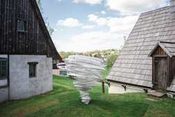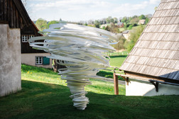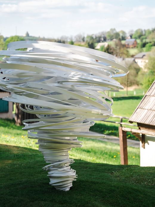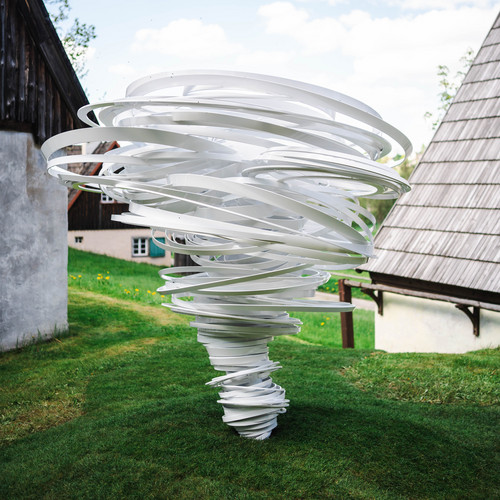 Cybernetics and entropy are the most important influences on Alice Aycock, a sculptor born in Harrisburg/USA in 1946. She learnt technical drawing and an understanding of construction and control engineering at her father's company, a successful plant engineer. During her art studies in New York, Aycock encountered the protagonists of land art, conceptual art, happenings and performance and became one of the most important artists of postmodern sculpture. In the late 1980s, she was one of the first artists to use 3D software for her artistic designs. The ‘entropic measure of the ignorance of the states of all individual particles’ (Richard Becker) determines the shape of the ‘Twister’ series. Starting from a point fixed on a square base, a dynamic vortex winds concentrically upwards. In the sculpture ‘Twister Again’, the swirling seems to have taken place in several phases: It drifts apart and is held in the state of a seemingly chaotic structure. The white powder coating on the aluminium strips that make up the sculpture gives it the appearance of a dynamised but undefined preform that leads to ever new discoveries of form through the power of imagination and observation.