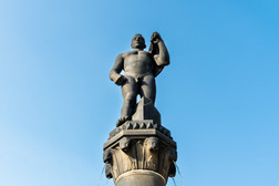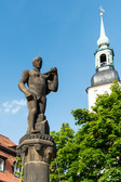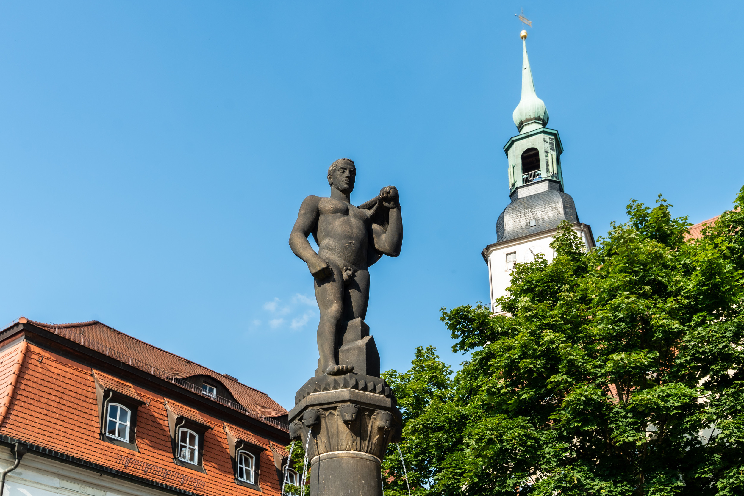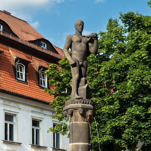 On a central, tall column in the basin of the Octagon Fountain on Frankenberg's market square stands a stylised figure of a naked man holding a hammer on his left shoulder, draped in lightly pleated fabric. A model house can be seen between the figure's legs and below its knees. Narrow streams of water flow from the column capital, which serves as the figure's pedestal. The powerful, expressionist representation, enhanced by the black-patinated Posta sandstone, was intended to reflect the working ideal of the German Empire, according to the plans of the Saxon Art Fund, which financed the sculpture. However, the project, which was to be implemented as early as 1914 at the suggestion of the Dresden Academic Council by the sculptor Arthur Heinrich Lippert, was delayed. This was because the artist Lippert, who was born in Waldheim in 1879 as the son of a chair maker and completed his master's degree at the Dresden Art Academy under the fountain sculptor Robert Diez, with whom Ernst Barlach also studied, was drafted as a soldier in the First World War at the beginning of the war in 1914. He continued to plan his sculpture for Frankenberg from the front. The hyperinflation that began in 1920 in the young Weimar Republic almost caused the project to fail again. Several appeals published in the Frankenberger Tageblatt in April 1921 raised the missing funds in a kind of municipal crowdfunding campaign, so that Lippert's work could finally be ceremoniously inaugurated on 7 August 1921.