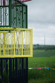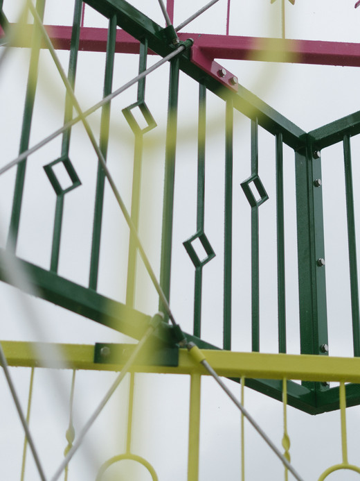 On a square ground plan, eight elements of different heights and colours are stacked at equal angles to form a tall tower. The artist Frank Maibier, who was born in 1959 in Werneuchen near Berlin and lives in Chemnitz, documented the formal and colourful models for the sculpture Ornamente on forays through the eight villages in the municipality of Lichtenau. As a sculptural homage to the cheerful stylistic pluralism of garden fences and their owners, Maibier's sculpture quotes their ornaments and has them realised by a master locksmith from the municipality. Maibier, who often explores the limits of stability and balance in his sculptures, installations and works on paper in order to question the principles of material laws and norms in both a concrete and figurative sense, dedicates his sculpture to Lichtenau's local spirit of resistance to the boredom of everyday objects.