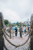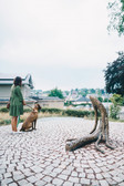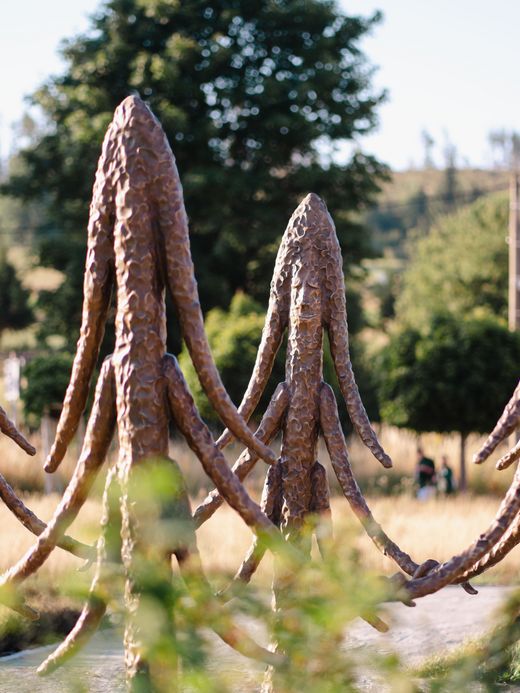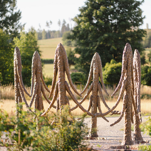 Seven sculptures reminiscent of stylised spruce trees with scaly bark. Six of them stand in a circle, each appearing to hold hands with the next, three branches sweeping out to either side. The sculptures have faces with lowered eyelids, pointed noses and a hint of a thoughtful smile on their narrow lips. The sculptor Friedrich Kunath, who was born in in 1974 in Karl-Marx-Stadt (now Chemnitz) and now lives in Pasadena in the US, has placed a seventh tree sculpture outside the circle. Its lowered branches somehow convey disappointment.
