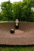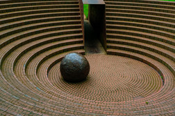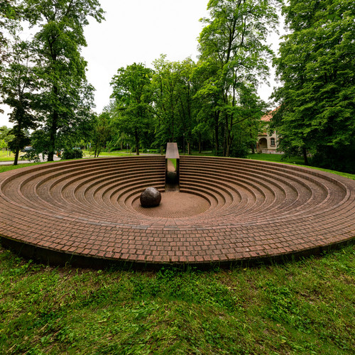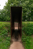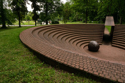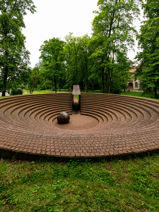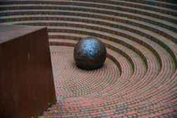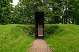 On the grounds of the Rehabilitation Centre for the Blind and Visually Impaired in Chemnitz, a tall rectangular tunnel made of Corten steel rises from a grass-covered earth wall. It leads past a pedestal bearing a quote from the Chinese philosopher Confucius to a stage-like centre. This is created by a circular depression reminiscent of an amphitheatre. Like unoccupied rows of seats, steps made of brick surround the space, which slopes down by 15 percent. An uneven, heavy-looking sphere with a cracked surface lies slightly offset from the centre of the space like an erratic boulder, creating an image as if a comet had struck the ground. Viewers involuntarily become actors in a scene of pure sensation that has fallen silent after the impact.