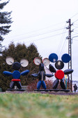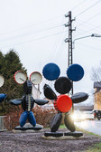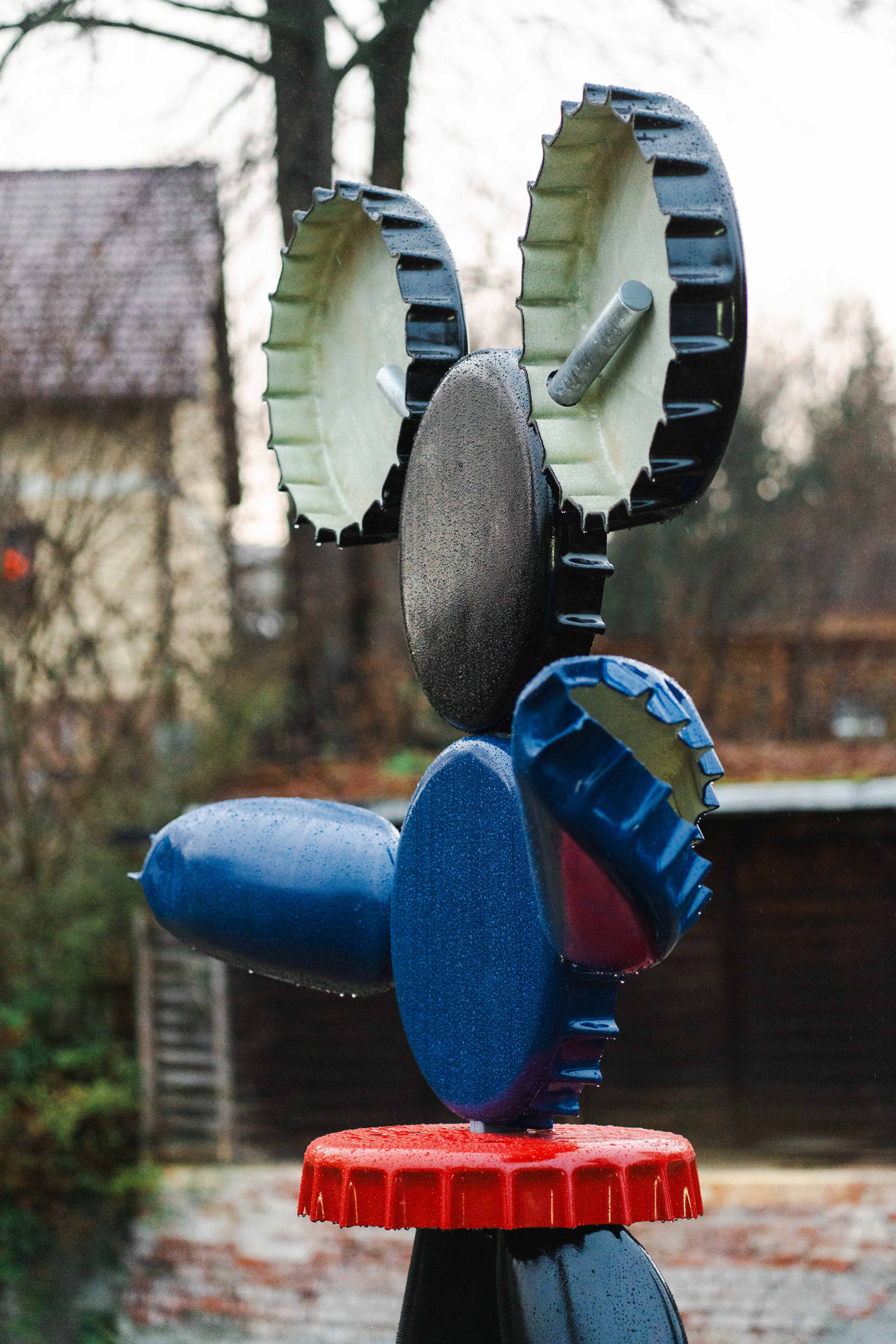 The Heimat Ensemble II group by painter, object and conceptual artist Jan Kummer consists of round elements of the same size, reminiscent of enlarged crown caps. The models for Kummer's sculptures seem to originate from the aimless tinkering in the private sphere of a GDR household, in which anonymous everyday materials were transformed into individual objects. The vertically or horizontally assembled or centrally folded elements with inwardly curved edges and 21 spikes in black, red, blue and green are reminiscent of Mickey Mouse, probably the world's most famous art figure. In the 1930s, the later world-famous American cartoonist and media entrepreneur Walt Disney created it from just three black circles. Kummer transfers the famous silhouette to the shape of patented, DIN-standardised everyday objects. In a playful and ironic exaggeration, allusion and scaling, disposable products made of thin sheet metal, which are actually only designed for one-time use, are elevated to a permanent work of art.