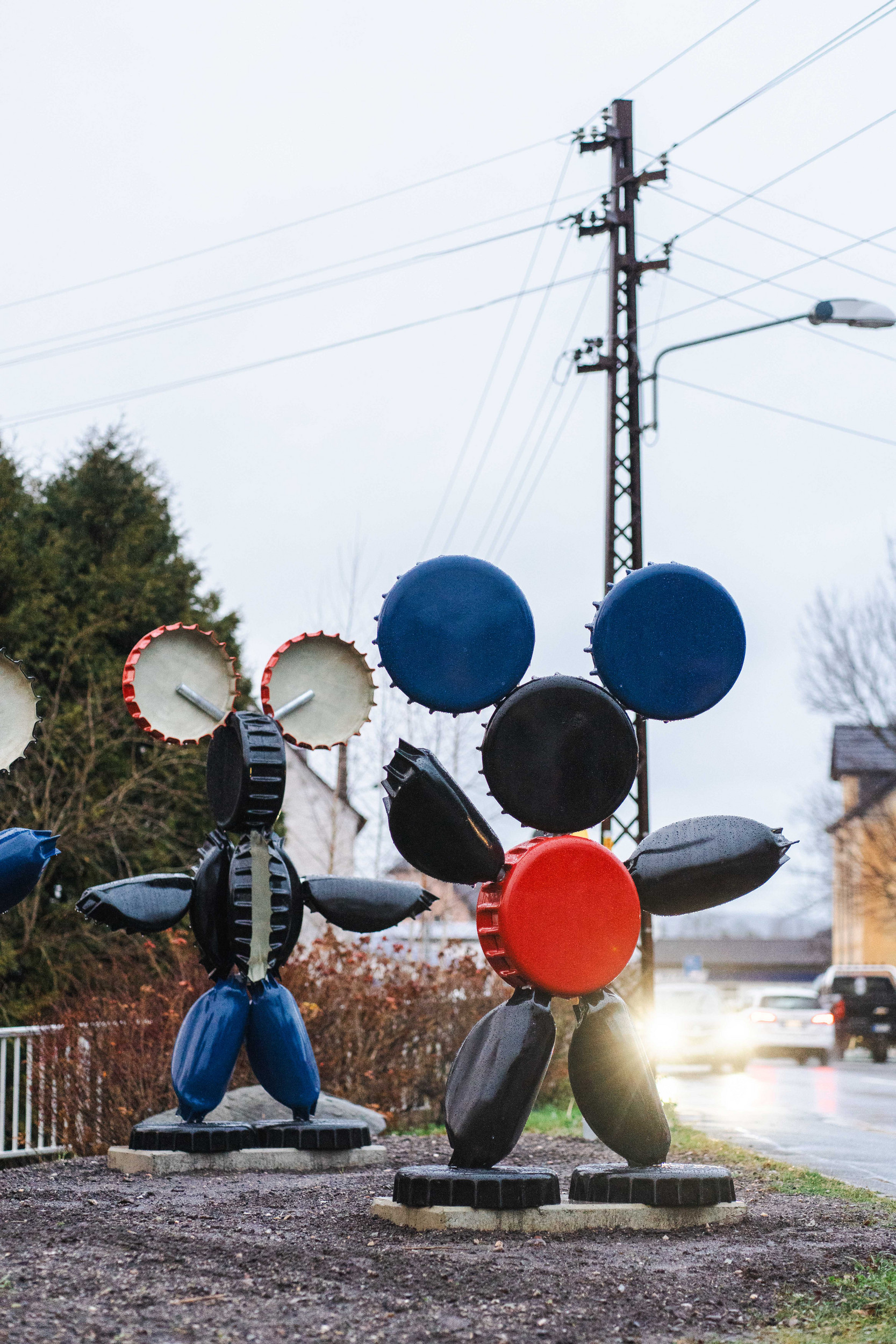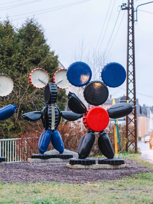 St Mary's Church, municipal administration, fire brigade, savings bank, model railway club, school - these are all central pieces of the mosaic that make up Heimat here in the centre of Gersdorf. Right next to the primary school is the Purple Path artwork 'Heimatensemble' by Jan Kummer. In terms of motif, he takes up the handicrafts made from crown corks that were made here and elsewhere during the GDR era. This association was obvious, as there is an important employer just a few minutes' walk away: the Glückauf brewery in Gersdorf.