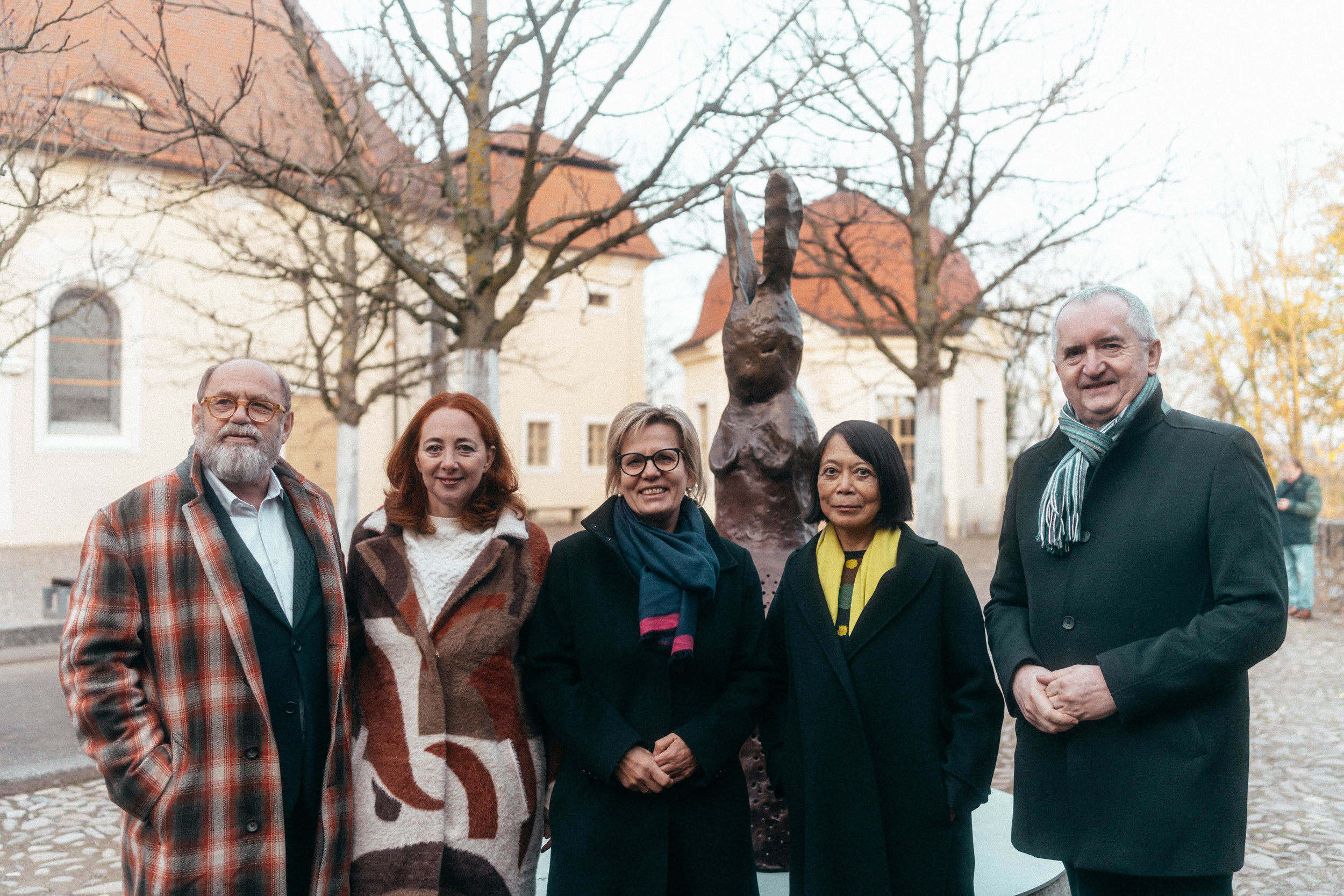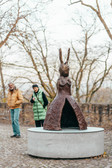The patinated bronze sculpture Usagi Greeting by the artist Leiko Ikemura, who was born in Tsu/Japan in 1951 and now lives in Berlin, is a pictorial-poetic encounter between the figure of the hare (Japanese Usagi) and representations of Buddhist bodhisattva beings and Christian iconography of mercy. The 180 cm high sculpture is the first realisation of this theme, which the artist has been working on again and again since 2002.
