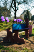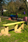 The two sculptures Juliana and Marjetka by the artist Maruša Sagadin, born in 1978 in Ljubljana/Slovenia, who now lives and works in Vienna/Austria, display playful humour in their cartoon-like forms. Who wouldn't want to take a seat on one of the objects made of concrete, wood and coloured paint? On a patch of grass where the rediscovered medieval pilgrimage route of the Saxon Way of St James makes a sharp turn in Adorf/Neukirchen, the artist cheerfully and cheerfully invites passers-by and residents alike to take a closer look at this place with her sculptures. With her sculptures, which reveal hints of feet or boots, and the use of bright colour, the artist invites viewers to discover and question social mechanisms, aesthetic codes and entrenched narratives in the social space of her installation site.