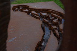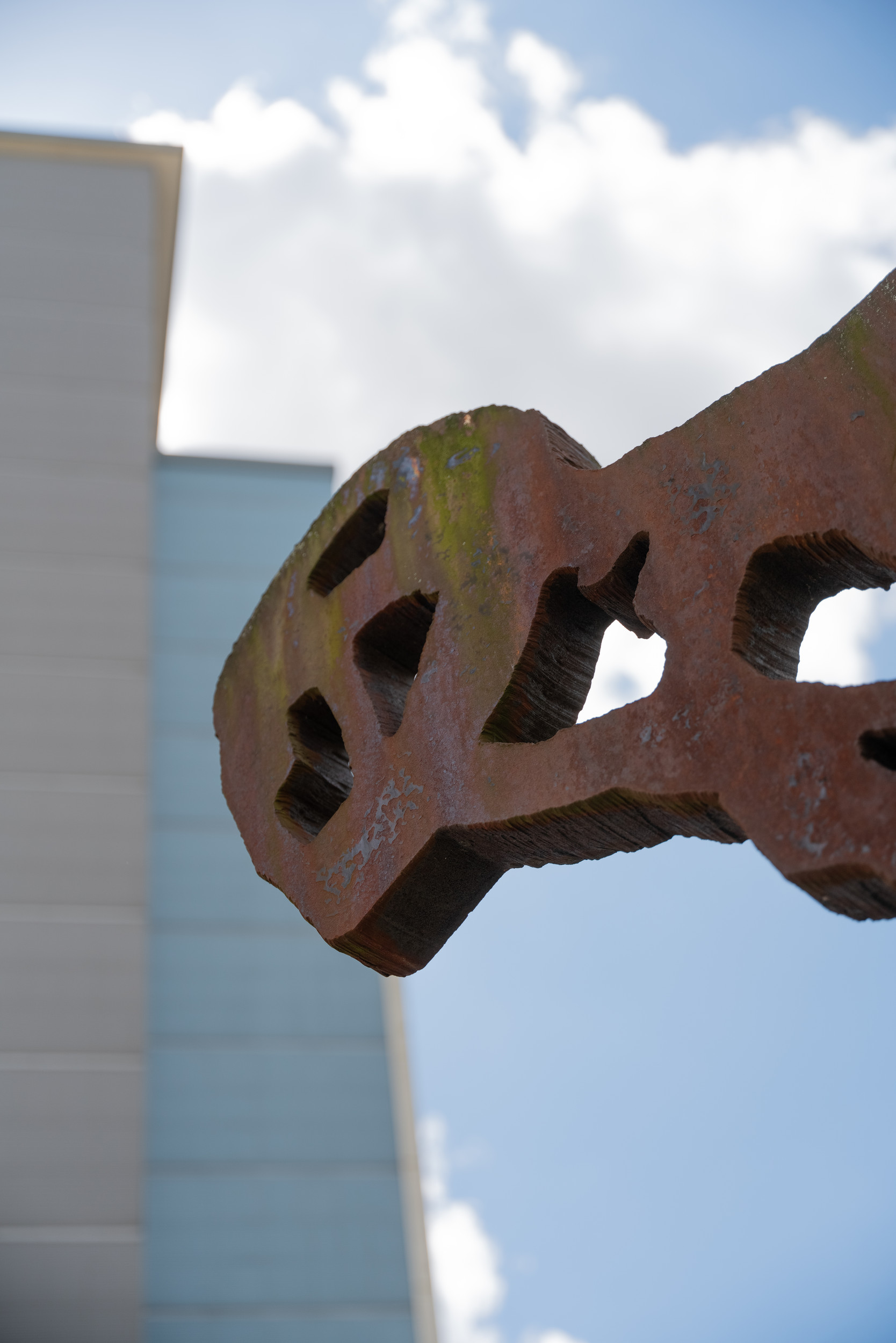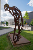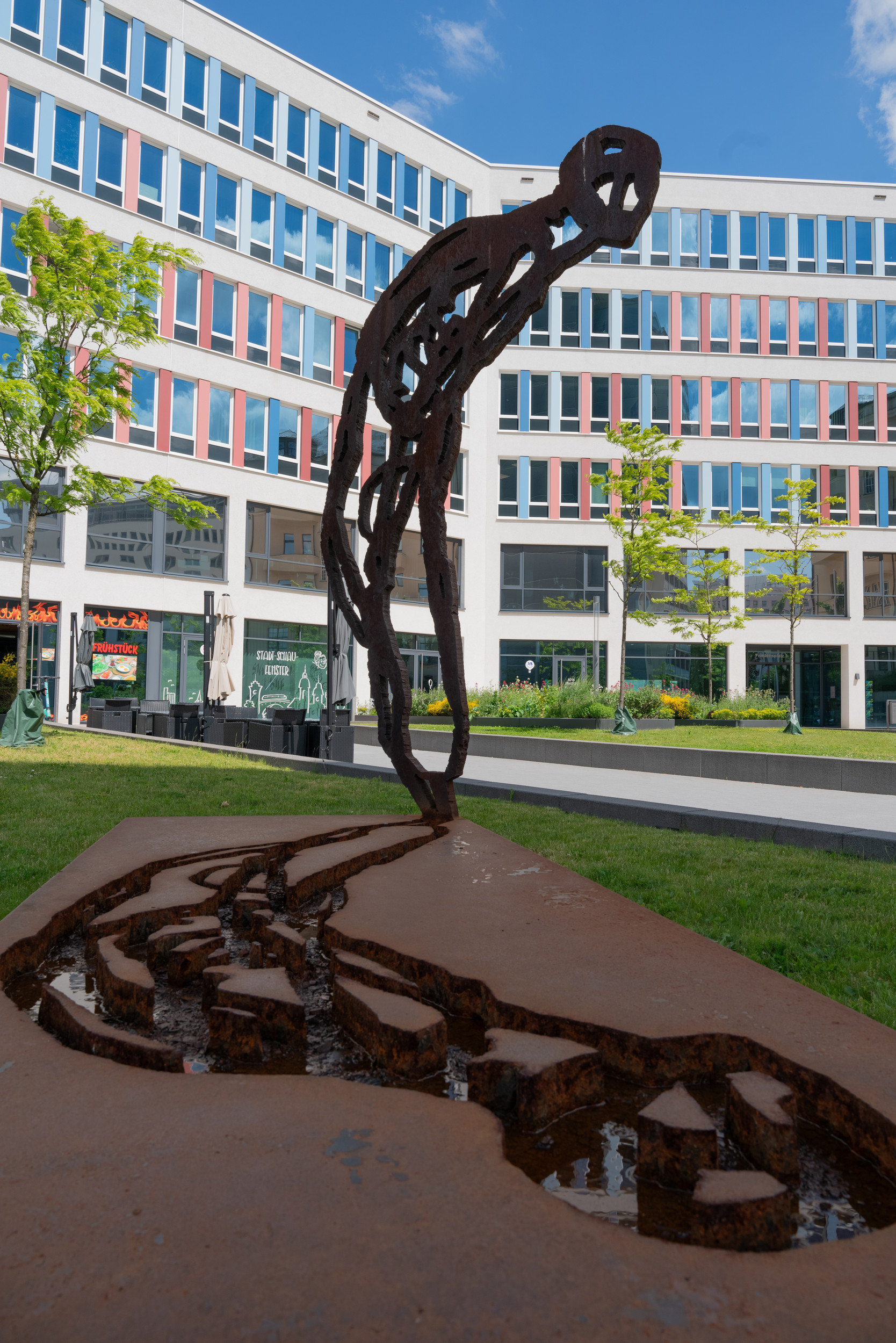 People are at the centre of Michael Morgner's works. Stylised into striking ciphers, his human images unfold a power between rebellion and sinking in, the fateful being thrown into the world and the urge to escape from it. The Chemnitz version of the steel sculpture, which Morgner has realised in several versions, is based on a rectangular, rust-red corroded steel plate resting on a low concrete plinth. Lines, webs and bundles were cut out with a laser and erected vertically as a silhouette. Rust and rainwater collect in the negative form of the base plate and reflect the sky above the sculpture depending on the incidence of light, weather and time of day. Morgner's human figure appears here as a figure of fear, simultaneously straightening and bending, travelling along the lines, paths and twists and turns that life draws.