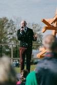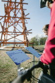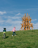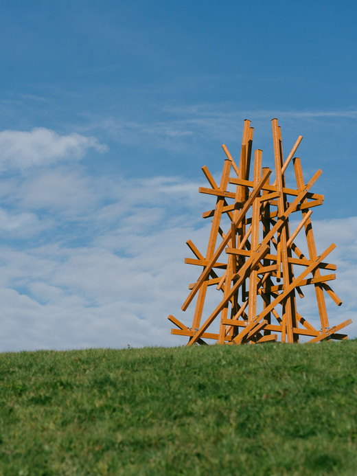 The conceptual artist Olaf Holzapfel, born in Dresden in 1967, places a sculptural-constructive work in the open landscape of the Dittersdorfer Höhe as a reminiscence of a childhood observation. Outer elements are evenly arranged around an inner structure of soaring square beams like a protective mesh. The two interlocking constructions are reminiscent of the wooden or steel towers that were erected in Saxony's turbulent landscape precisely above fixed points and served as surveying stations in the network of the Royal Saxon Triangulation [sic!] in the 18th century for mapping the kingdom. These stations, visible from afar, were constructed in such a way that the areas for people and for technical instruments functioned separately, as the measurement results were to be recorded as undisturbed as possible by heat, vibrations or the weight of human bodies.