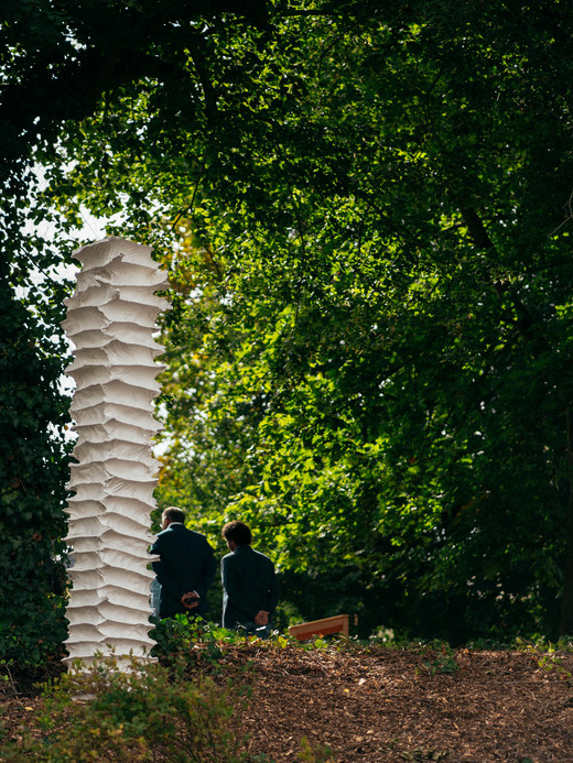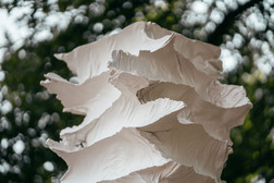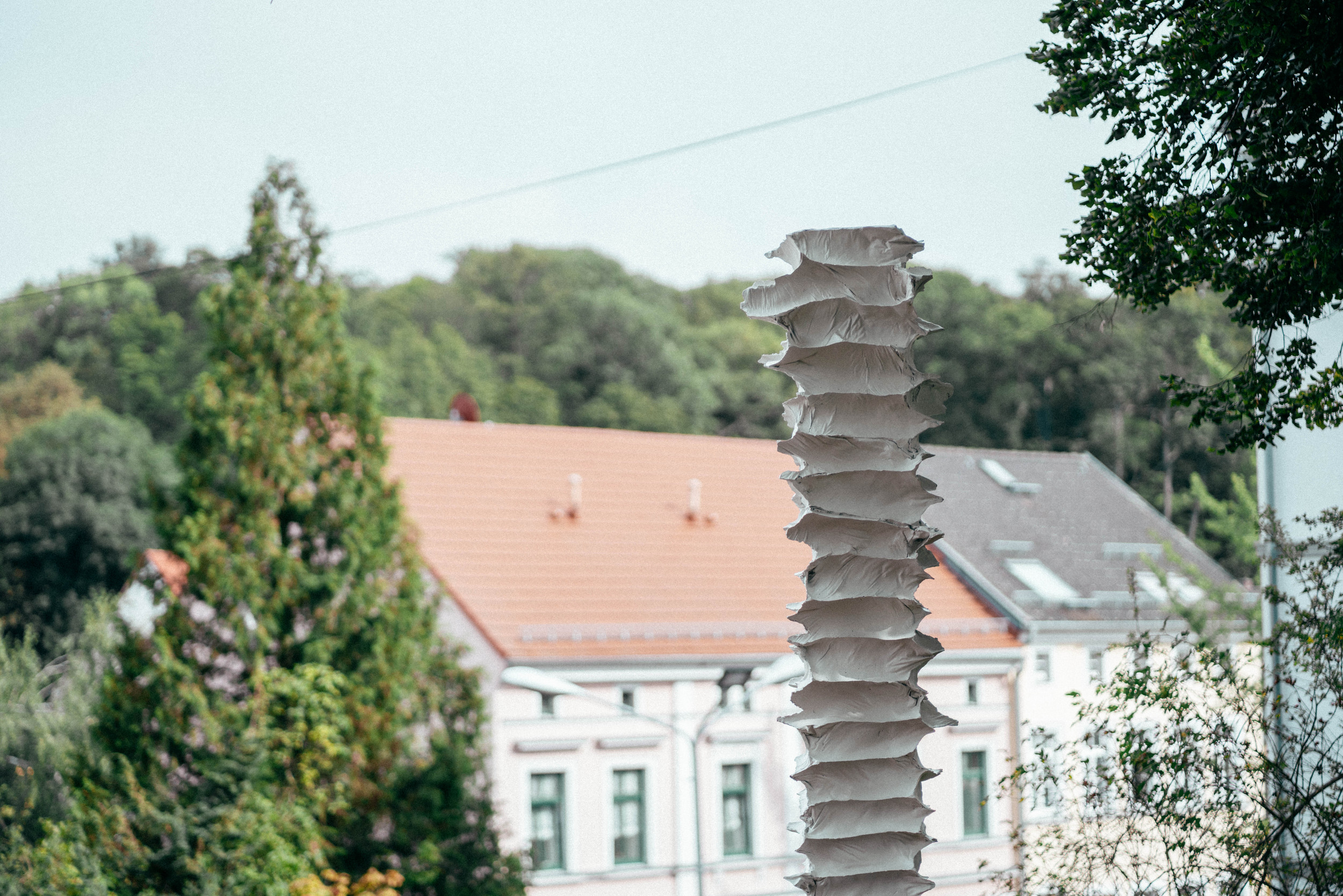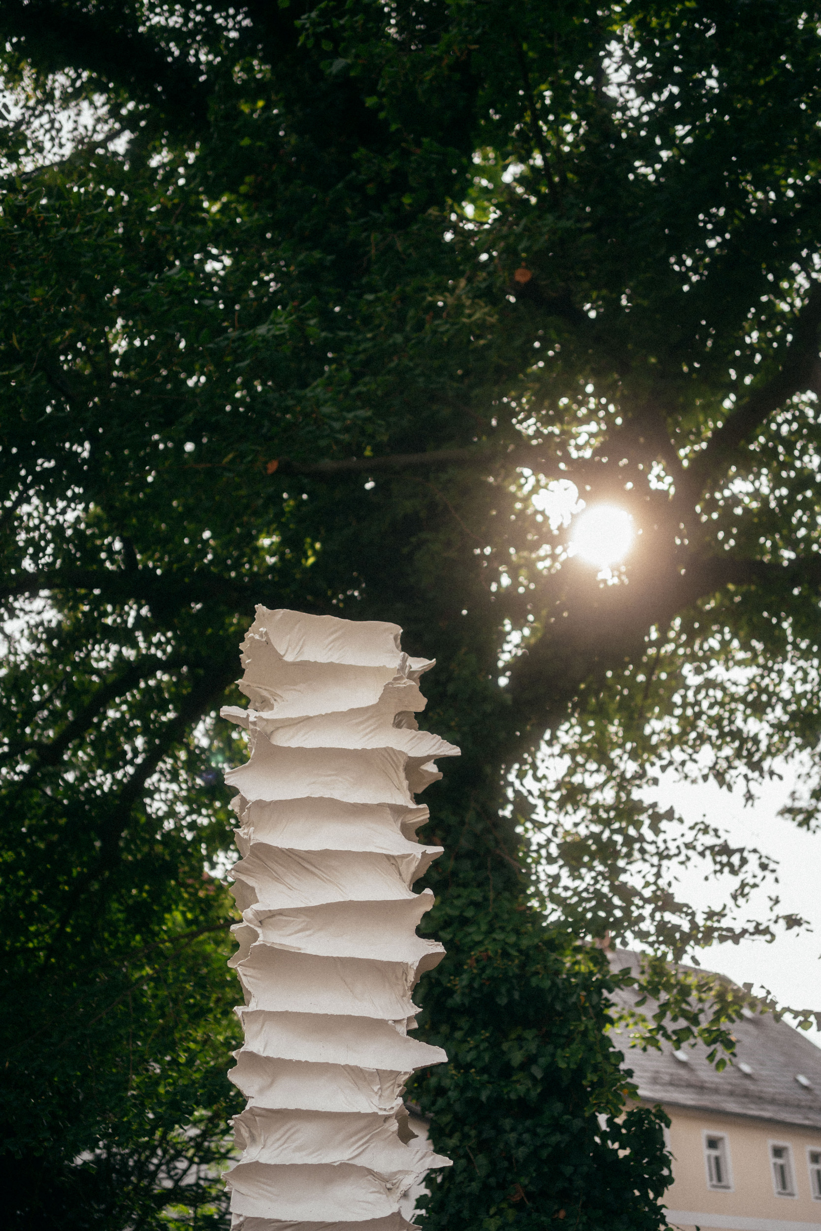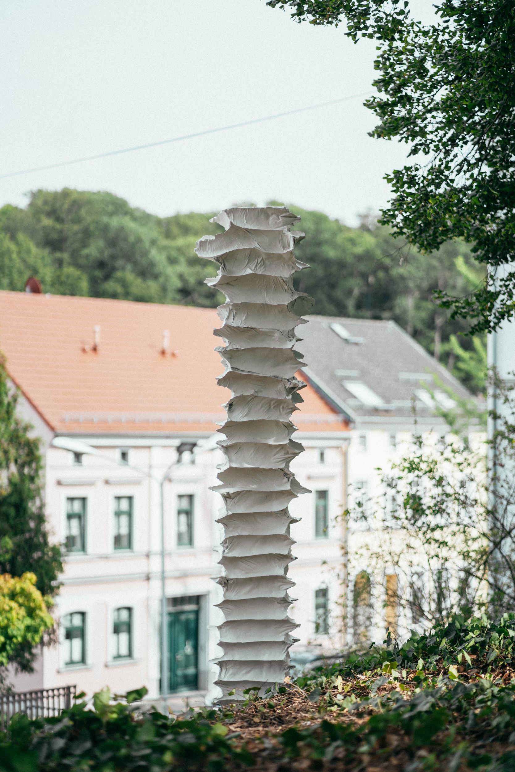 The sculpture Endless Column, whose title alludes to the iconic works of Romanian sculptor Constantin Brâncuși, appears to fill negative space with soft pillows or sacks arranged in a square around a central point and stacked on top of each other. Like a narrow white pillar, its layered, irregular recesses rise vertically into the sky, filling an infinitely expandable void. Ank’s sculpture feels like a fragment of an infinite and never-ending process, like a layering-up of paper shapes and sometimes even thoughts.
