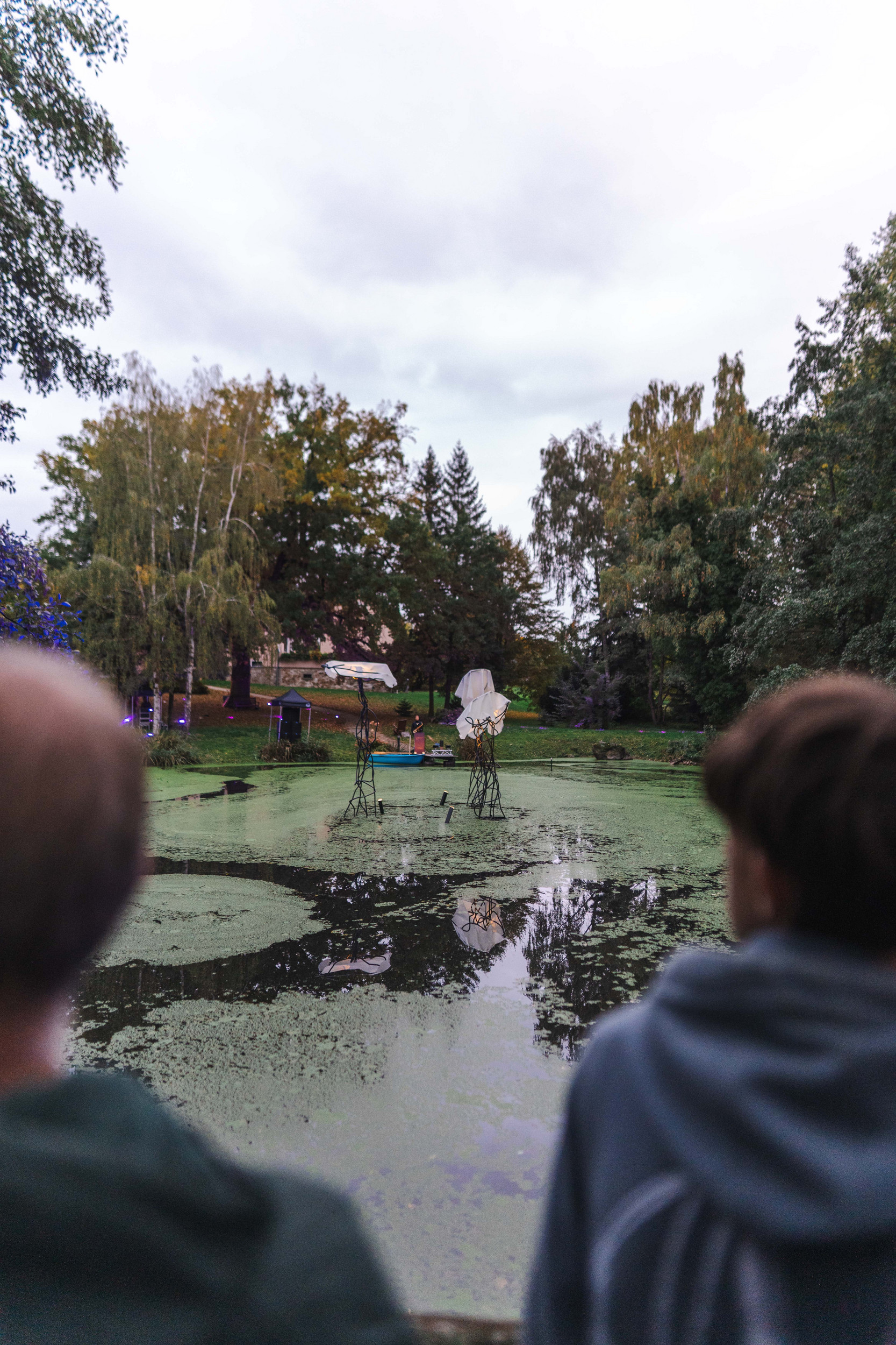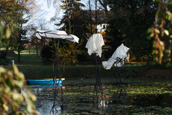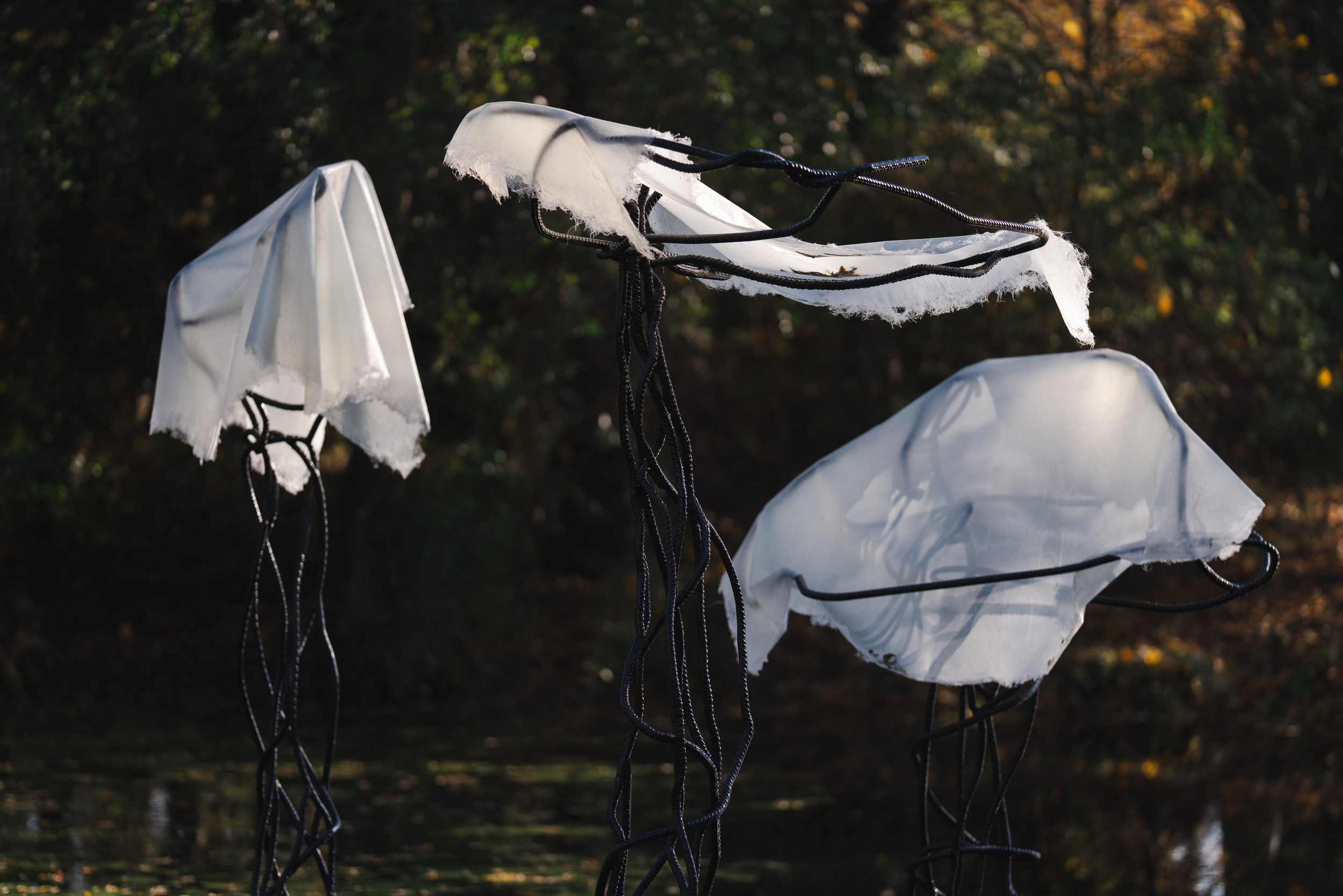 Drei zarte Gestalten schweben über dem Anlagenteich von Callenberg. Ihre Körper bestehen aus verdreht aufstrebendem, pulverbeschichtetem Armierungsstahl, die einer schnell hingeworfenen Zeichnung ähnlich aus der Oberfläche des Wassers hervorstreben und eine von unten beleuchtete, an einen Schleier erinnernde Gaze in die Höhe zu heben scheinen. Die Skulpturen „Ghosts“ (dt.: Geister) der polnischen Künstlerin Monika Sosnowska (*1972, Ryki/PL) erzeugen im Widerspruch zur Schwere des Materials einen Zustand von Flüchtigkeit. Aus der diffusen Tiefe des Teichs manifestieren sich Gedanken oder Erinnerungen zu subtilen, scheinbar tanzenden Gestalten, die zugleich Vertrautheit wie Vergänglichkeit versinnbildlichen. Sosnowskas „Ghosts“ lassen die Grenze zwischen Erfindung und Realität verschwimmen. Die aus Architektur und Fahrzeugbau entwendeten technischen Materialien wie Stahlarmierung oder mit Epoxidharz verstärkte Glasfaser werden zu fragil wirkenden Konstruktionen. Sie stellen Fragen nach dem Erbe der Moderne und ihren Versprechungen, nach Beständigkeit und ihrem Scheitern – und nach dem, was davon in unserer Gegenwart Bestand hat.